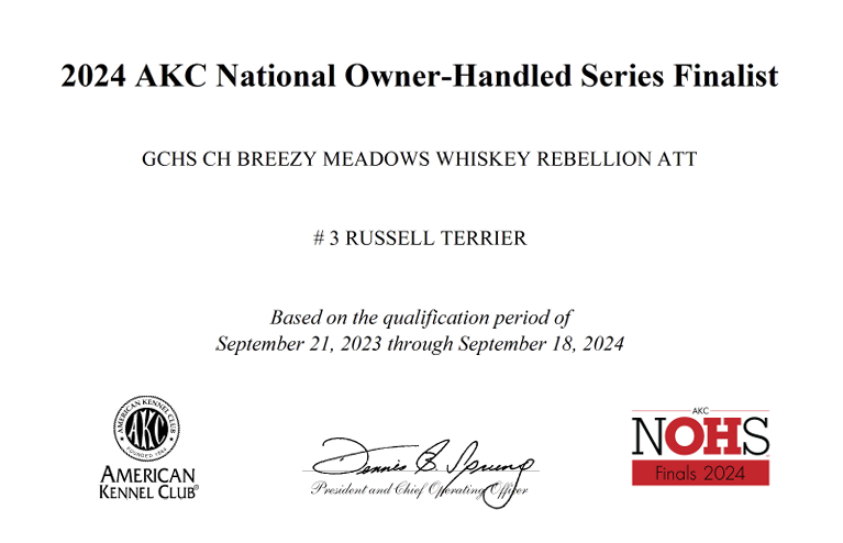 He finished the 2024 season (September to September) ranked #3 Owner Handled, and is currently sitting #6 Overall (Jan-Dec) Russell Terrier in the USA. He finished the year as #3 Owner Handled Lifetime Achievement
